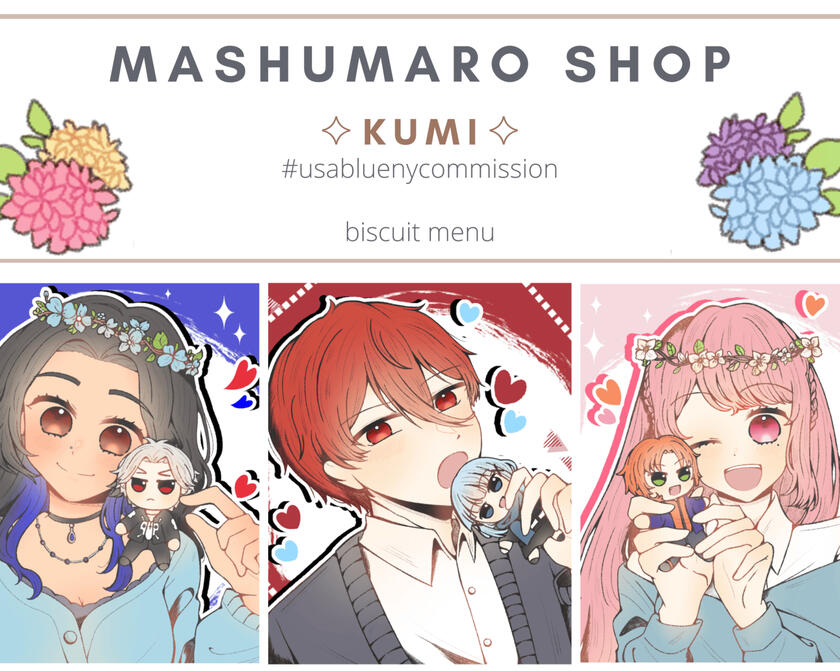| Biscuit Crunch Style | Character + Nuigurumi | Bust Up | 85K (no flower crown) & 100K (with flower crown) | 20USD (no flower crown) & 25USD (with flowet crown) | Transparant, Simple BG |