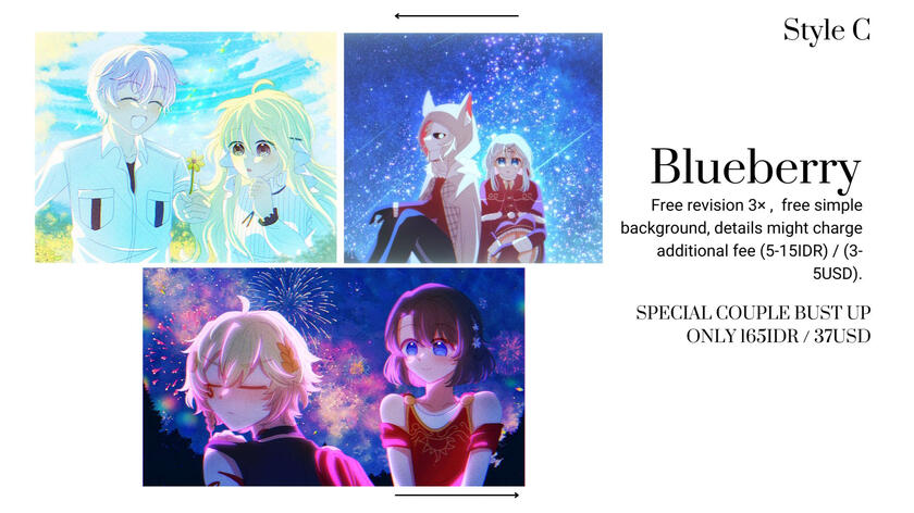 1) Tell me before hand if you don't want your commission being post in my instagram account or another my media social! Or if you want me to post on certain date. Since i will use it as a sample if you don't say anything about it.2) Couple or more details will be charge double or additional fee, depend on how much the characters and the details.3) These price commission on the catalogue for personal use only. If you want to commercial use the commission. The price of art will be double from the normal charge.4) NO NFT's & AI use. Please, do not claim it as your work! And for editing the artwork (change the art) please ask me before!5) I have rights to decline your order if i find it difficult or i can't draw it because i feel uncomfortable.6) If you buy more than 300k or 70USD, you will have chibi headshot as bonus! (*You can discuss it with me, which style do you like to have)7) Request background that a little bit complex cost 10-25IDR / 5-8USD. Add details (like complex outfit etc) have additional fee, is around 5-15IDR / 3-5USD✦✦✦❢ How to Order。1) Please provide clear or detail reference, it will helps me so much.